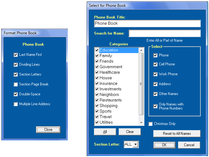 Clickon the toolbar, select 'Phone Book' from the Features Menu, or click 'Phone Book' on the EZ Address Book Screen to display names, addresses, and phone numbers in a printable format. The report is indented for punch holes when printed.